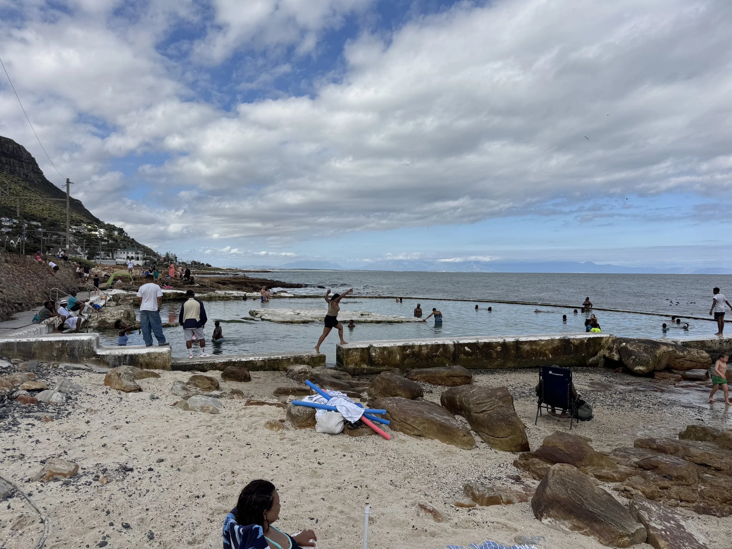 Next, we made our way along False Bay to the charming area of Kalk Bay. Unlike the sandy beach we’d visited earlier, this stretch of coastline is rocky, but it was still full of families happily splashing around and enjoying the water in the tidal pools. Tidal pools in South Africa feel like perfectly placed swimming pools right on the edge of the ocean. Built into the rocks along the shore, they fill with fresh seawater as the tides come in, creating calm, protected places to swim while the waves crash just beyond the stone walls. That mix of ocean views and gentle water is what makes them so popular. They’re simple, safe, and relaxing — a way to enjoy the sea without worrying about strong currents or rough surf, which is why families especially love them.