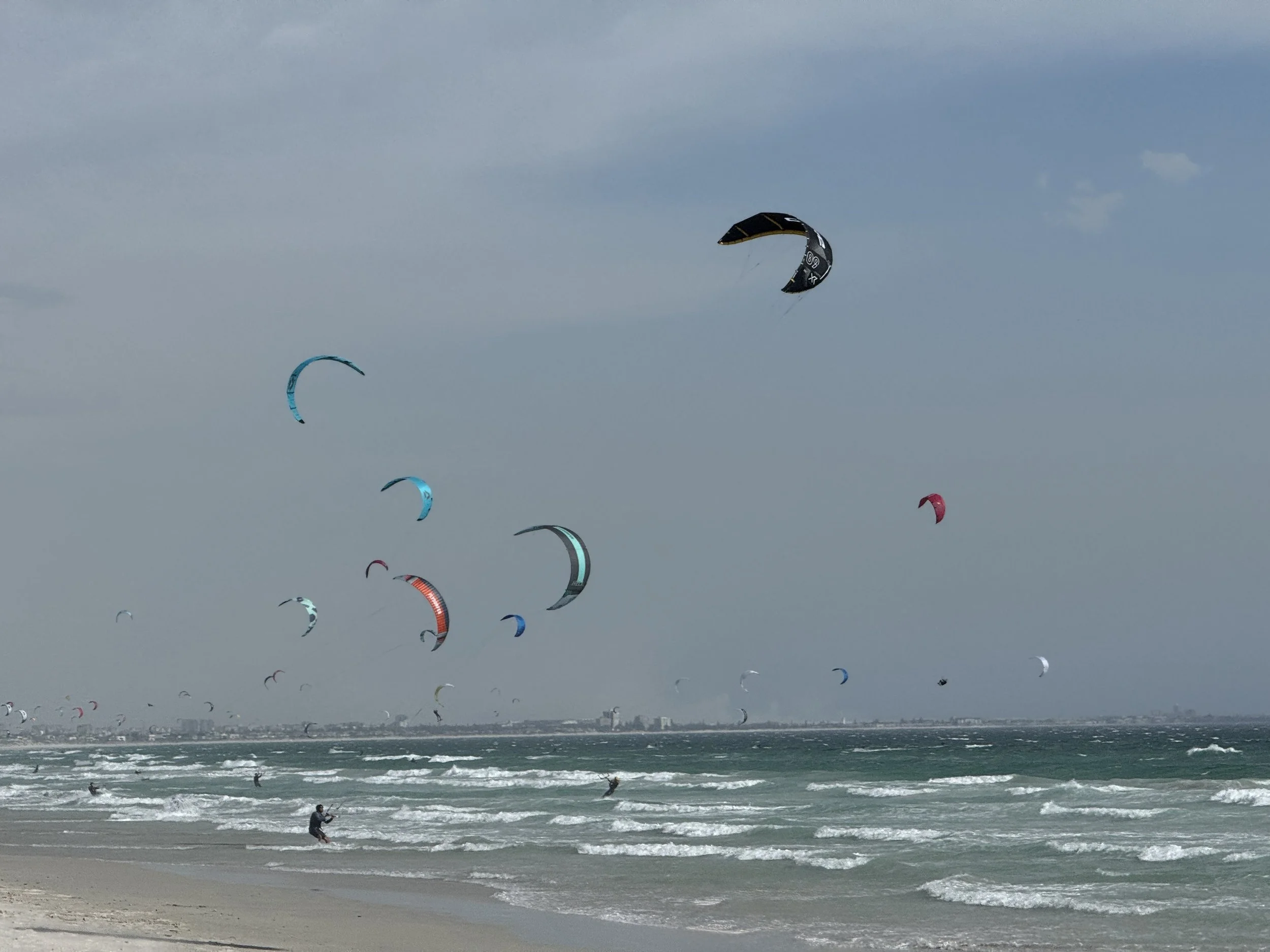 We were treated to even more spectacular views as we came down off the mountain and headed toward Bloubergstrand Beach. This beautiful stretch of blue water and wide sandy shoreline is a favorite spot for kite surfers, and it was easy to see why. There seemed to be kites everywhere — easily a hundred of them spread along the beach — with surfers launching into impressive jumps and twists high in the air. We stood there for quite a while, completely mesmerized, just watching the colorful kites and the incredible skill on display.