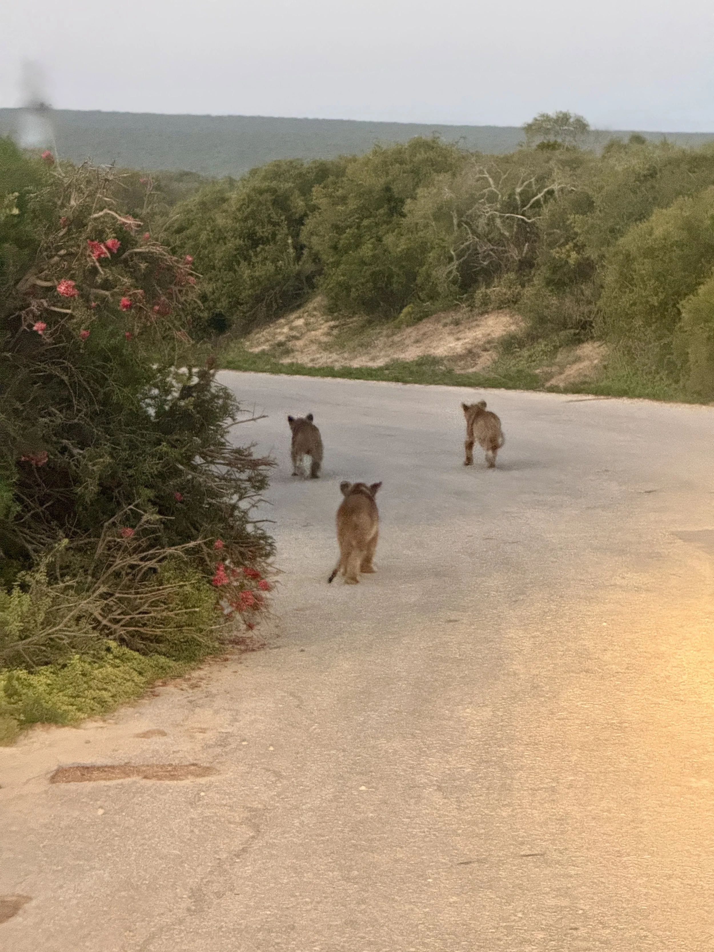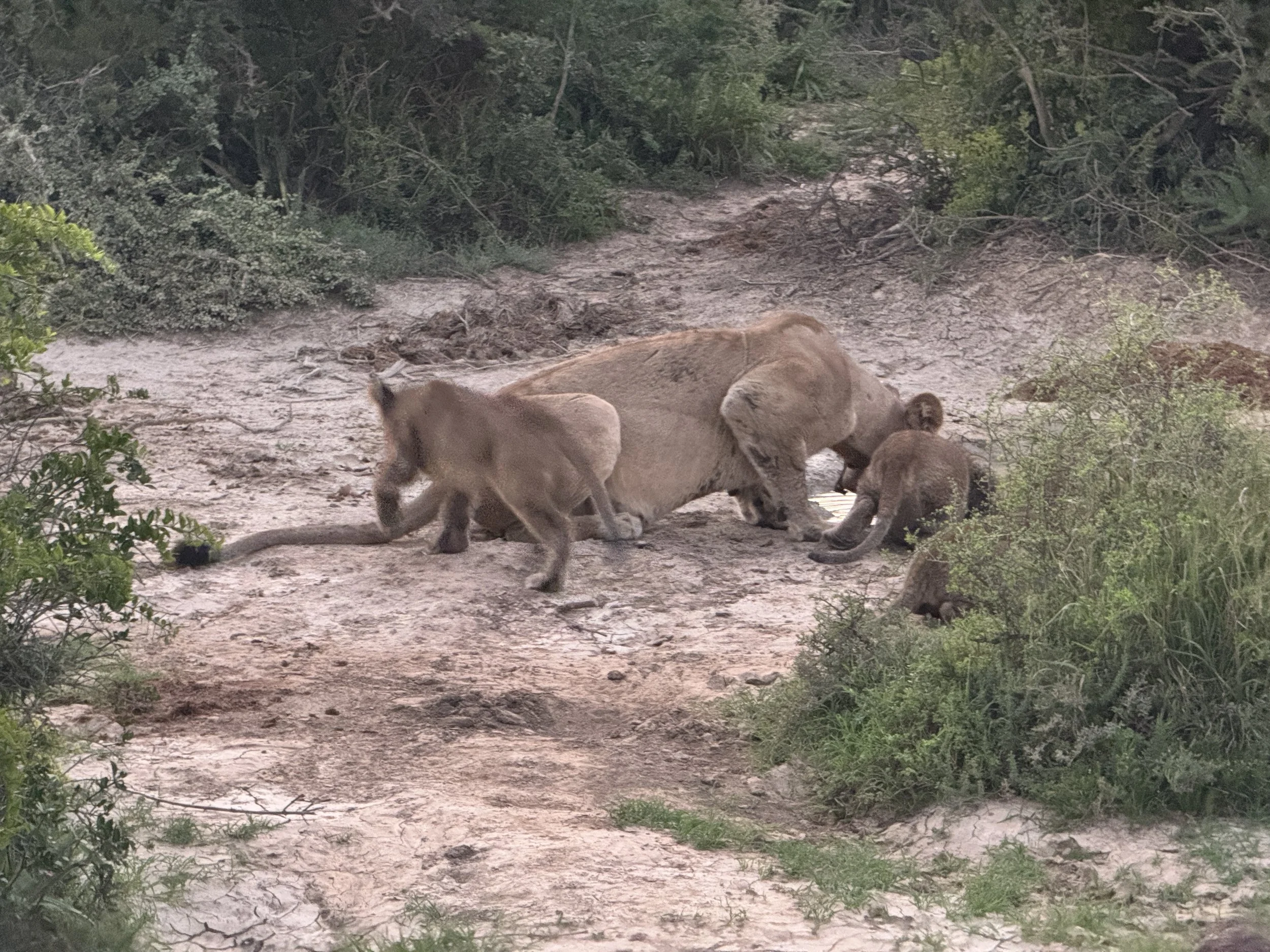 Another big highlight of our self-drive safari in Addo Elephant National Park was getting into the park right when the gates opened at 5:30 a.m. Driving in at that hour, with the sun rising, was incredibly peaceful. The park was quiet and still, and the soft morning light made everything feel a little magical. Not long after entering, we came across something really special—a lioness with her four cubs. She was sitting and staring at us at first, but when it became clear we weren’t a threat, the five of them calmly trotted down the road. We slowly rolled along a good distance back, trying not to disturb them.