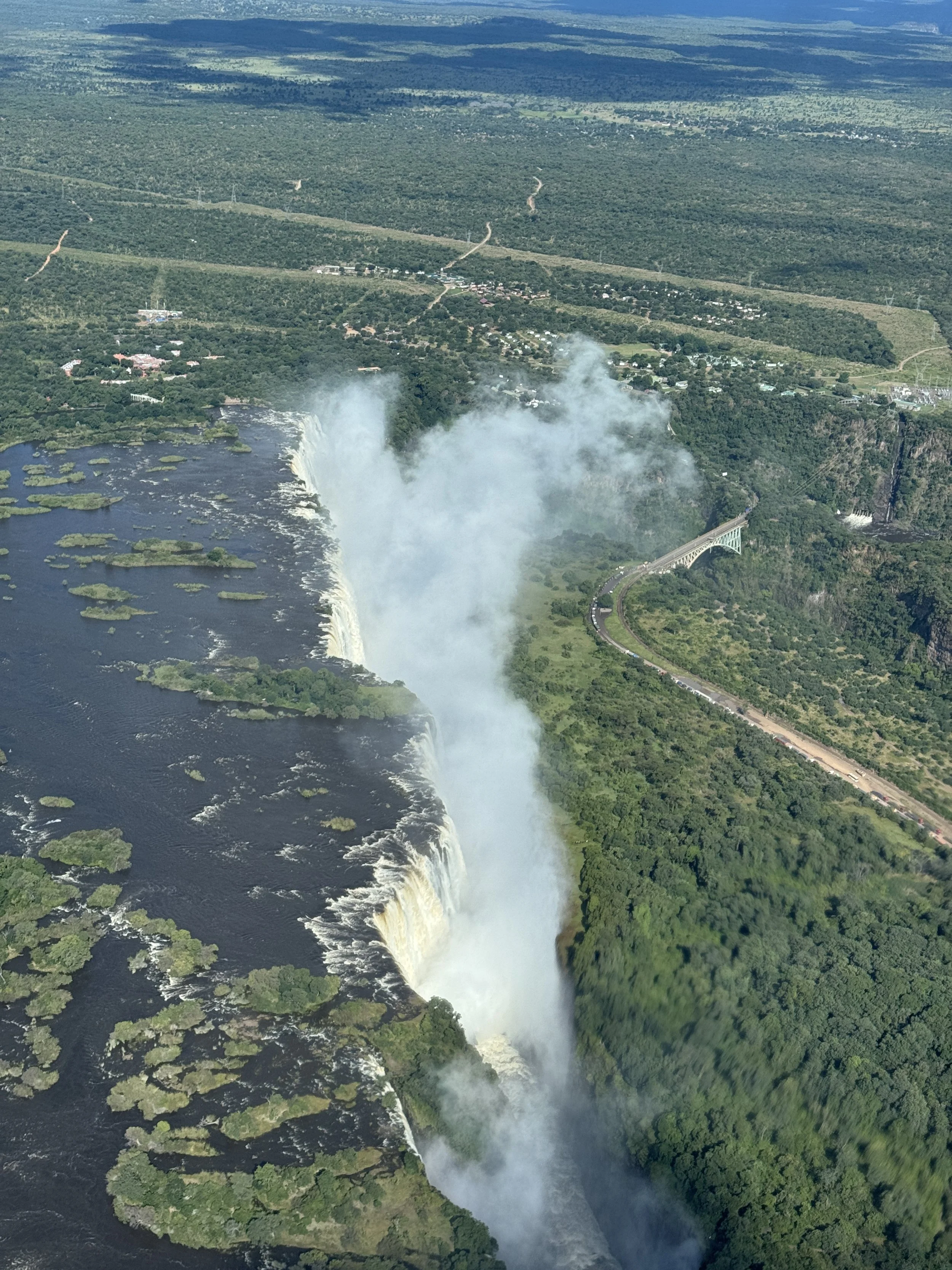 Later in the day, we took in a completely different perspective with an optional helicopter ride over the falls. Seeing it from the air gave me a much deeper appreciation for its sheer size and shape, as the water plunges into a long, narrow gorge along the Zambezi River. From above, I could even spot the bridge we had walked across earlier, which made me realize just how small a section we’d actually experienced from the ground.