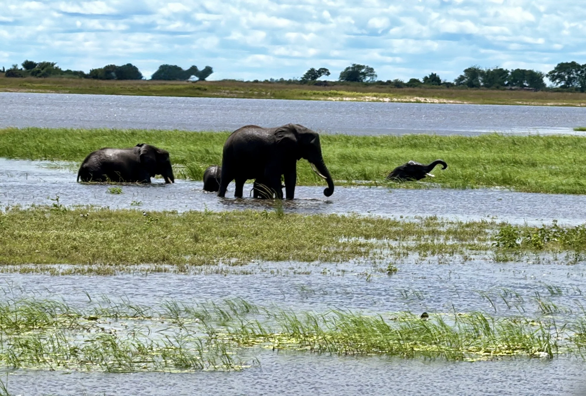 During the cruise on the Chobe River, we enjoyed lunch while watching the wildlife as we drifted by. At one magical spot, a large group of elephants had gathered in the water. The older elephants sipped and cooled their feet, while the younger ones splashed and played. I could have watched them frolic in the river for hours.