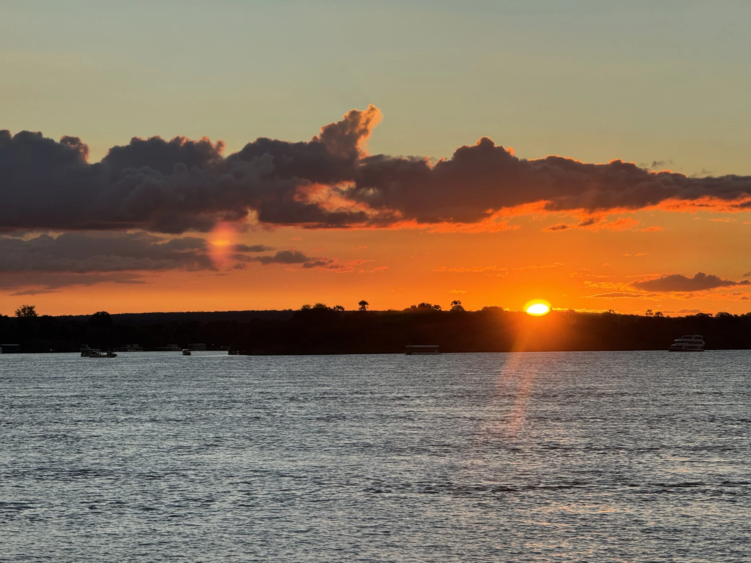 Our adventure in Zambia began with a relaxing sunset cruise along the Zambezi River, well upstream from the falls. Drifting gently on the water, we spotted wildlife along the banks and watched the sky come alive with the colors of the setting sun.